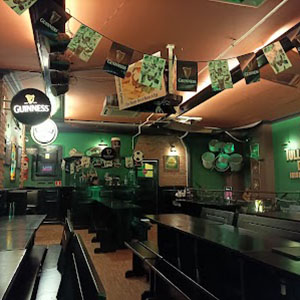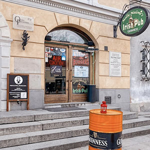 Классический ирландский паб в туристическом центре Варшавы. Тёмное дерево, плотная барная зона, несколько уровней, подвальные залы.