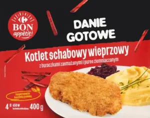 Эту позицию можно искать в сети Carrefour. Она есть в разделе готовых обедов и закусок. Похожие обеды с пюре и овощным гарниром встречаются там же. Близкие аналоги есть и у U Jędrusia.