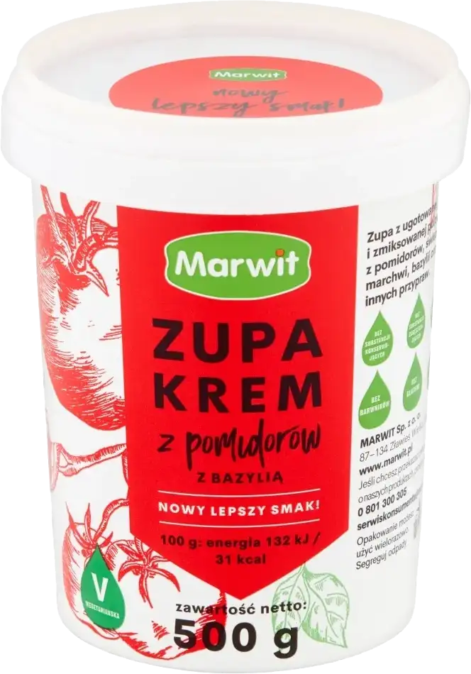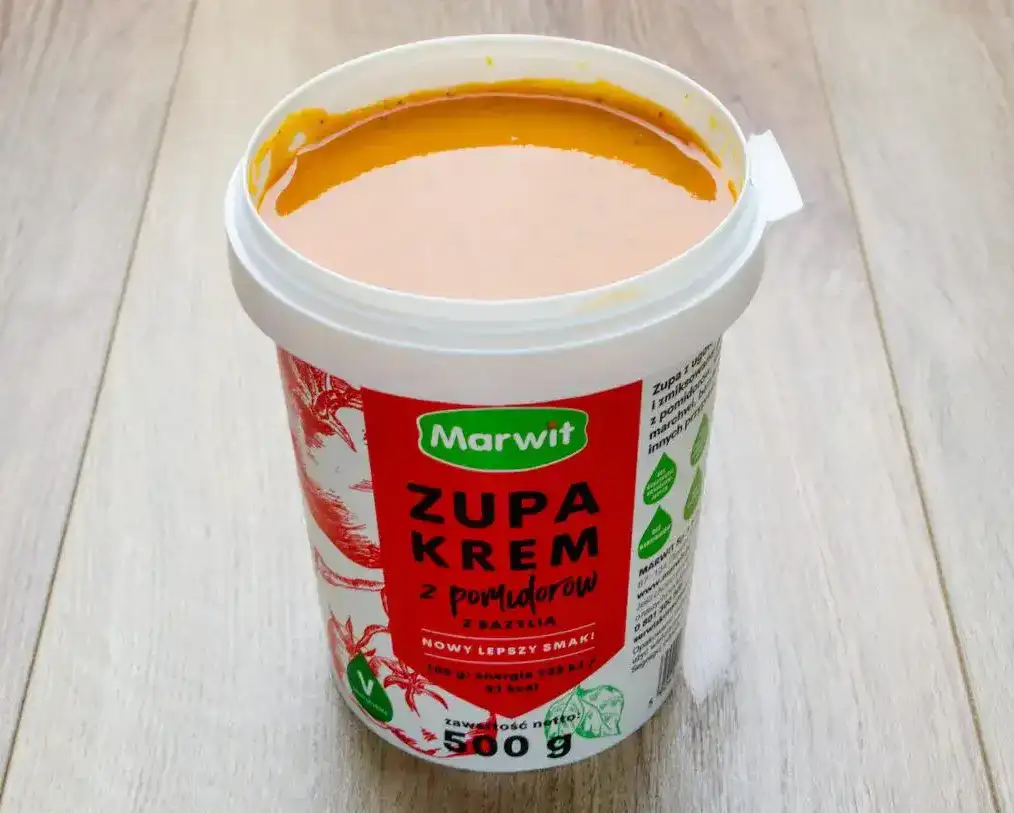 Готовый охлаждённый суп-крем в пластиковом контейнере. Marwit Zupa krem z pomidorów z bazylią – это продукт без этапа приготовления – достаточно открыть и подогреть или употреблять сразу.