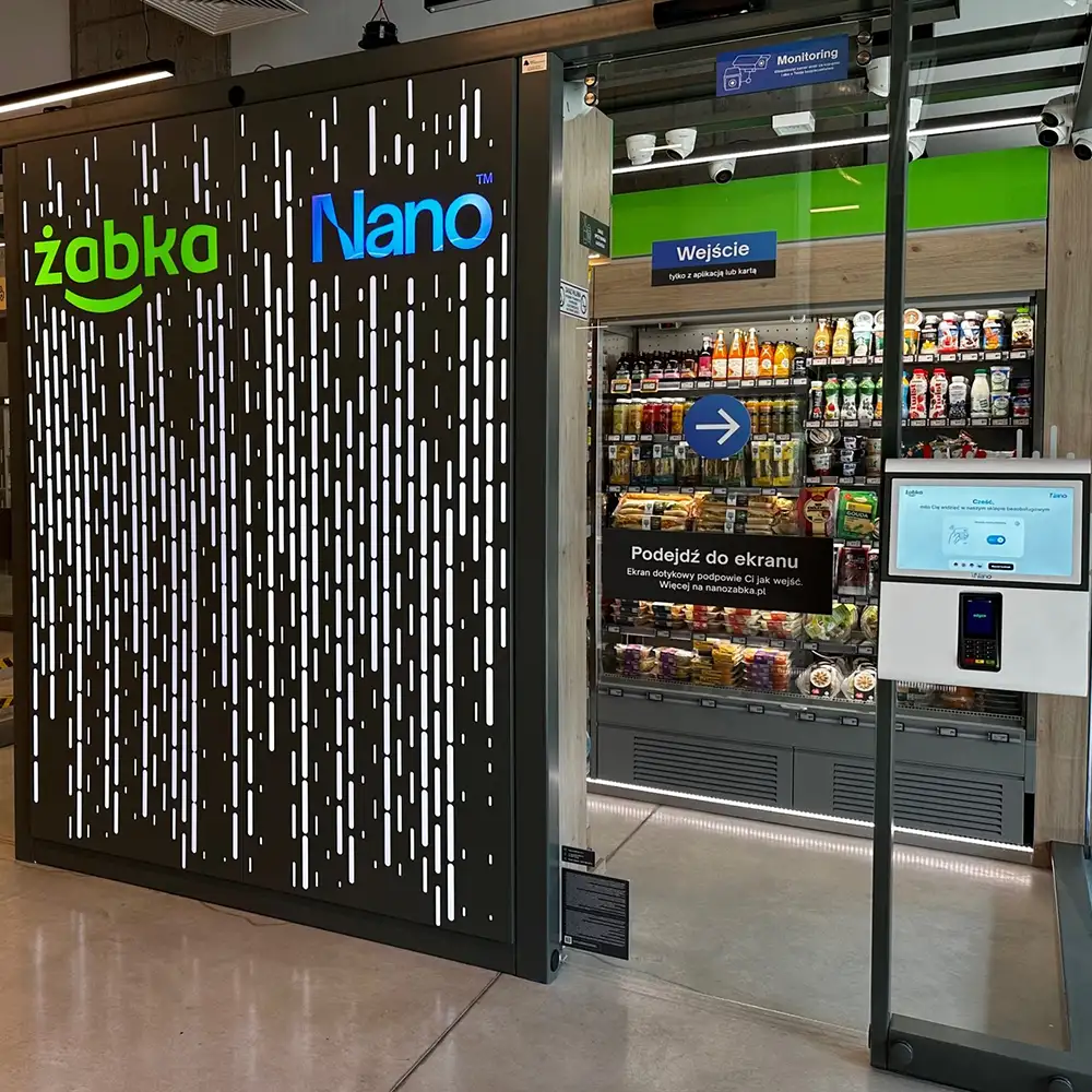 Автономный формат магазинов сети Żabka. Это точки без кассиров и без касс. Внутри нет персонала. Покупатель заходит по бесконтактной карте или через приложение. Дверь открывается после идентификации.