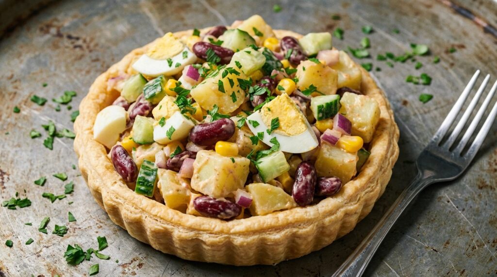Этот картофельный салат с фасолью сочетает мягкий вкус отварного картофеля и яиц с сочностью огурцов и сладкой кукурузы – простой, но сытный вариант для холодного закусочного стола.