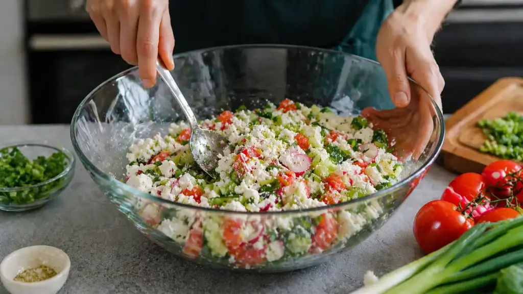 - Белый сыр задаёт основу вкуса – он мягкий, но с лёгкой кислинкой. Важно не перегружать его лишними добавками. Овощи должны оставаться свежими и хрустящими. Огурец лучше брать плотный, без лишней воды. Помидоры подойдут мясистые – они держат форму и не дают лишний сок. Редис добавляет резкость, но его легко переборщить. Если вкус уходит в остроту – часть редиса убирают.