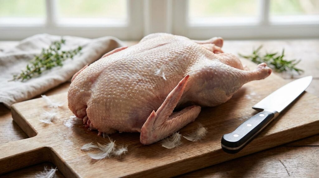 Перед началом приготовления тушку гуся стоит внимательно осмотреть и удалить оставшиеся пеньки пера, если они есть.