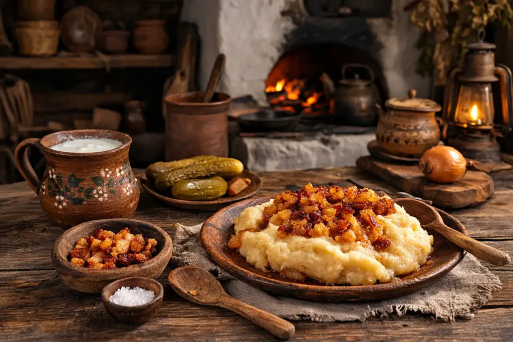 - Горячую массу выкладывают ложкой или кусками, а подают со шкварками, луком, кислым молоком или огурцом. Поэтому региональность здесь строится не только на составе, но и на локальном имени, бытовой подаче и устойчивой связи с конкретной территорией.
